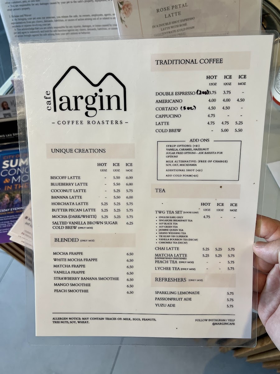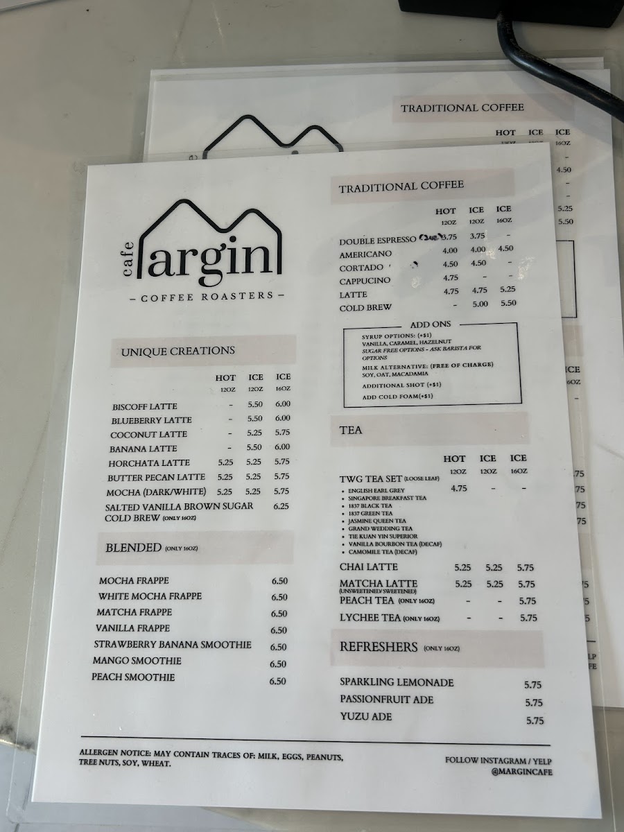 At Margin Cafe Coffee Roaster Menu, every cup tells a story, and each dish brings something fresh to the table. Located at 1123 Grand Ave in Diamond Bar, CA, this cozy spot is a go-to for coffee lovers who crave an experience as rich as their brew. The menu features a delightful range of expertly roasted coffees, crafted with precision and care, and paired perfectly with a selection of mouthwatering pastries and light bites. Whether you're grabbing a quick pick-me-up or settling in for a leisurely break, the warm ambiance and thoughtfully curated menu make every visit something special. From the first sip to the last bite, Margin Cafe Coffee Roaster offers a flavorful journey that keeps you coming back for more.